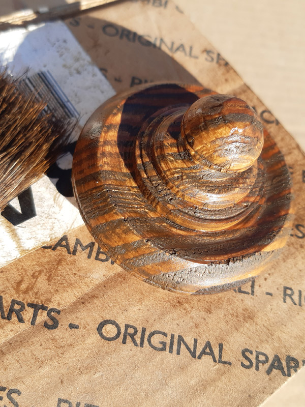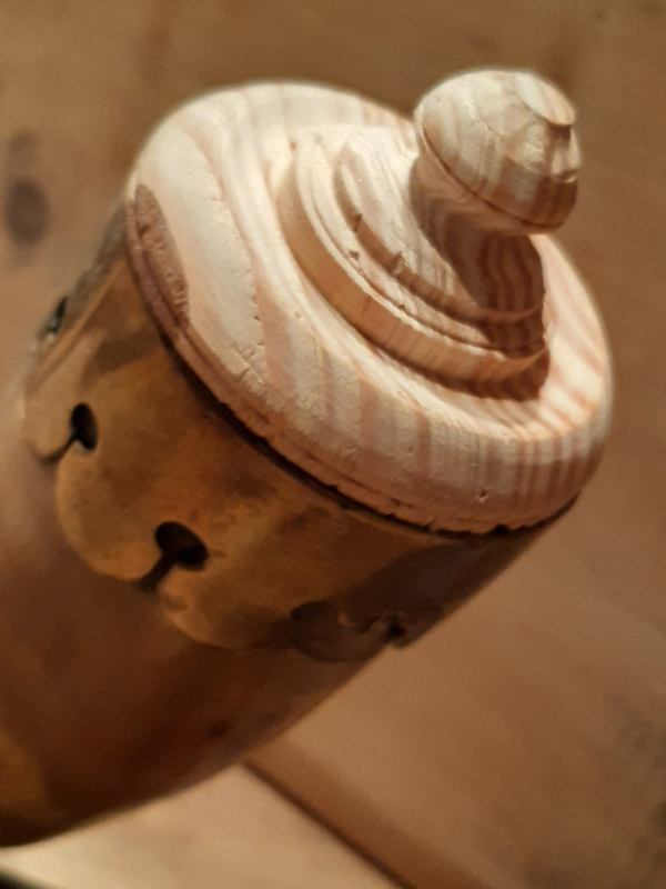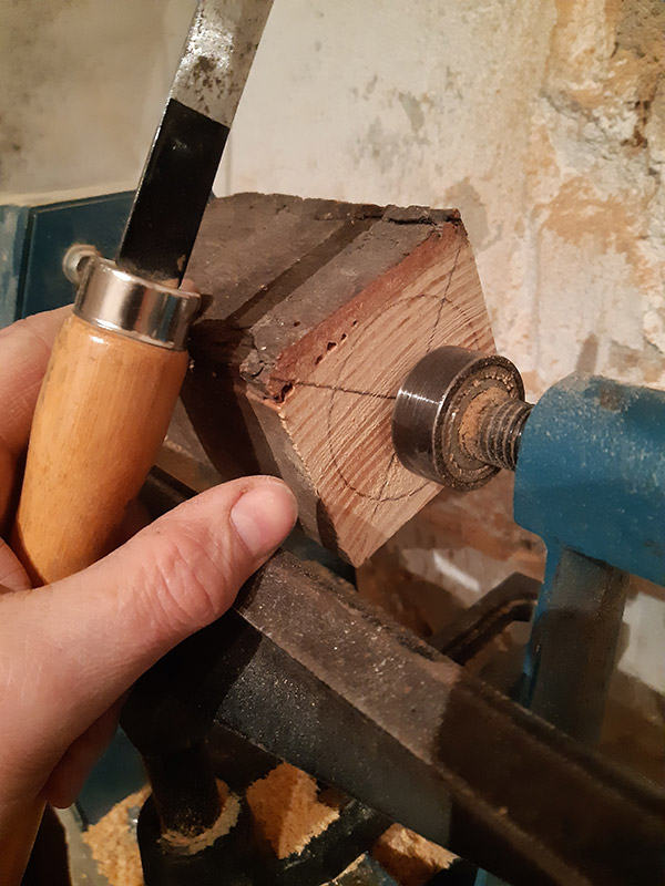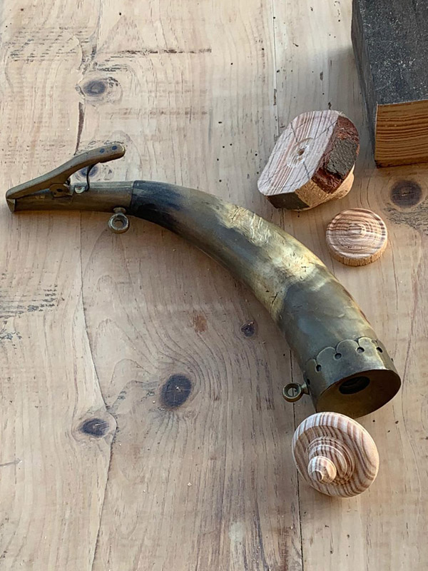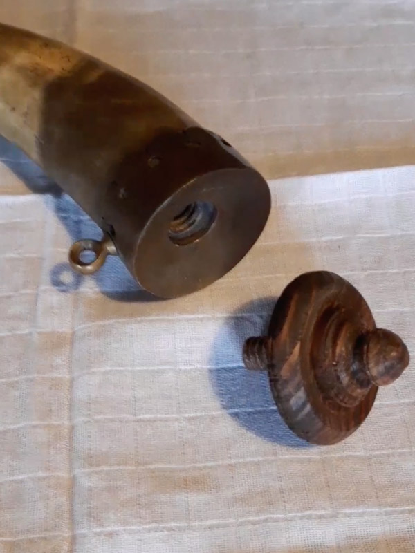 Nel restauro di questo corno serviva tornire un nuovo coperchio dal perno filettato per la chiusura.