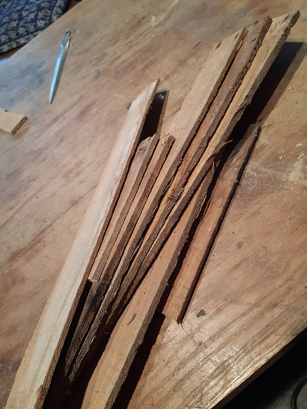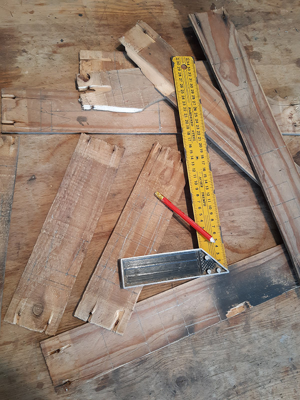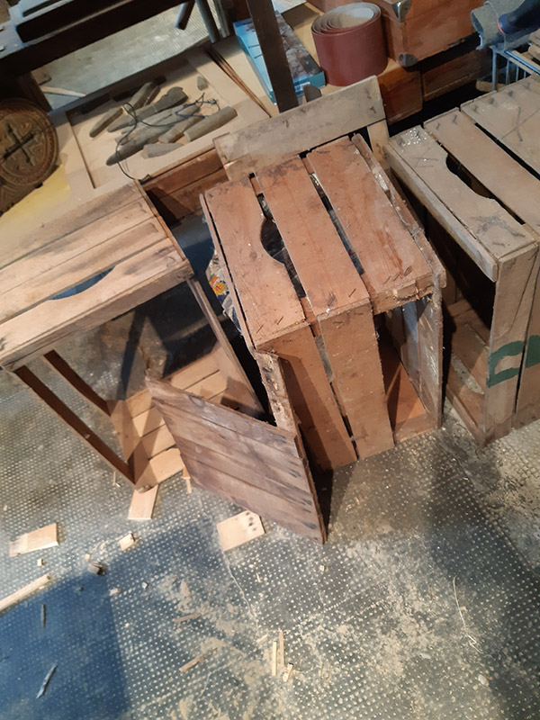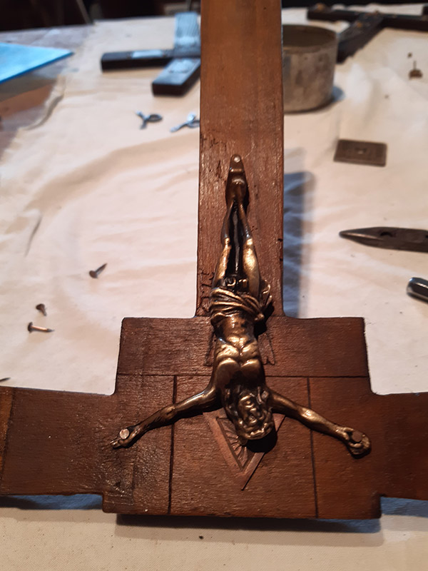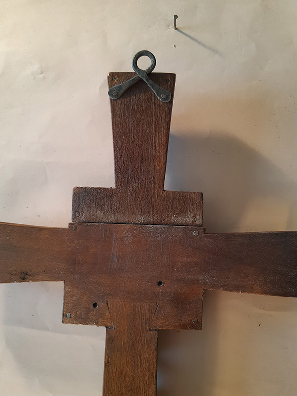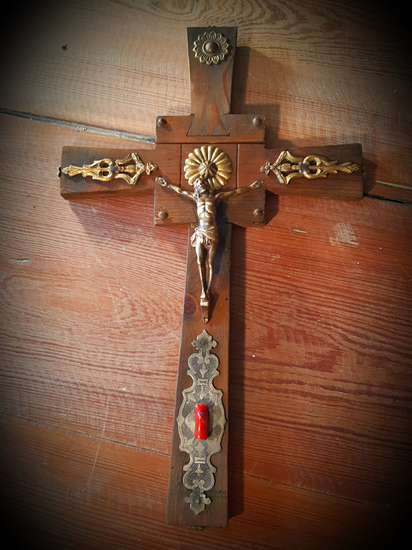 Per ottenere l’effetto vissuto e secolare del crocefisso ho scelto di realizzarlo con il legno recuperato da vecchie cassette della frutta.