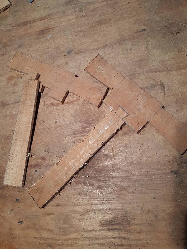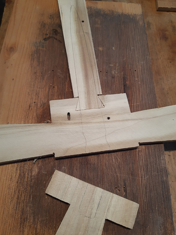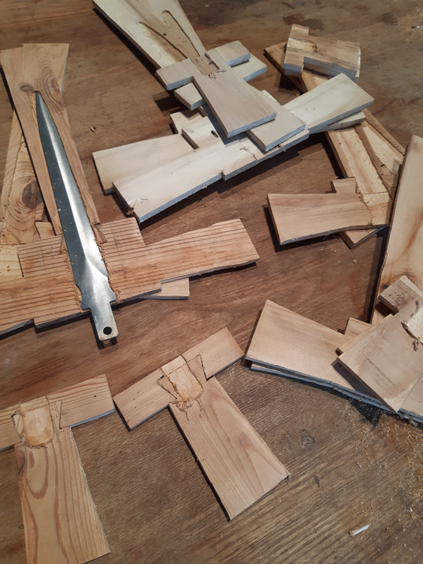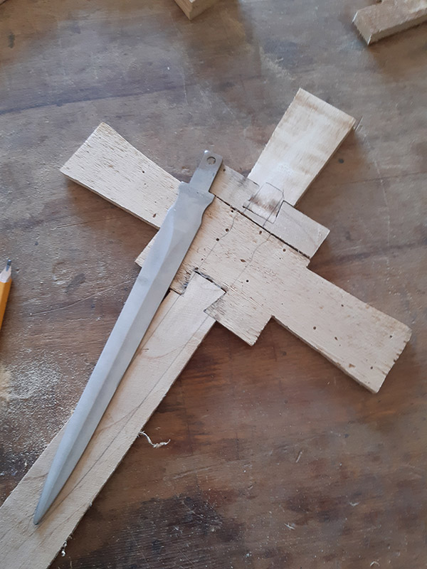 Ritagliata la forma a crocefisso ho fresato la sagoma del pugnale sui due guanciali.
