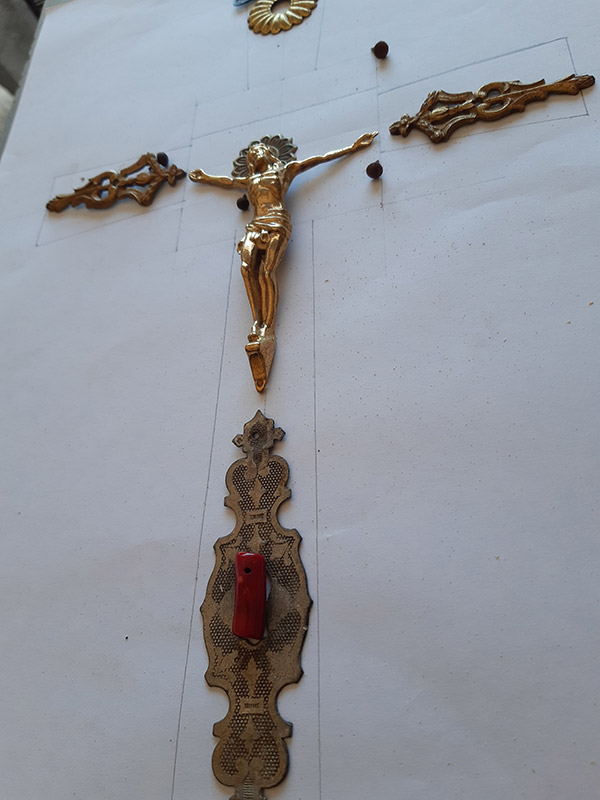 Infine il montaggio con tutti gli elementi scelti per il crocefisso. Ho voluto inserire ai piedi del Cristo, su di una cornice cesellata , un pezzo di corallobambù come riferimento alla passione del redentore secondo un iconografia tipica europea.