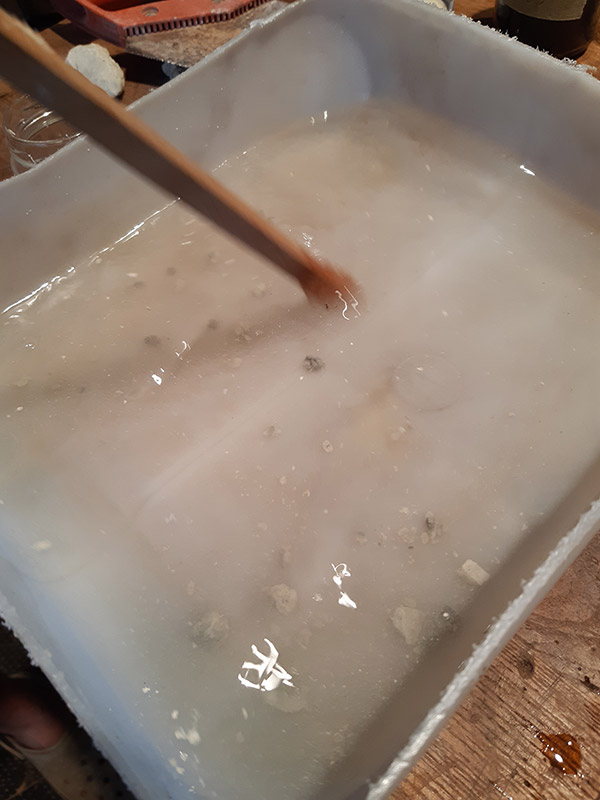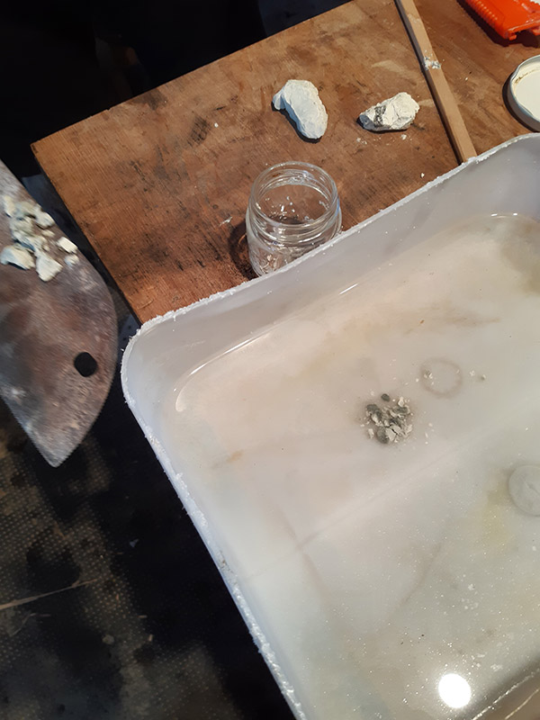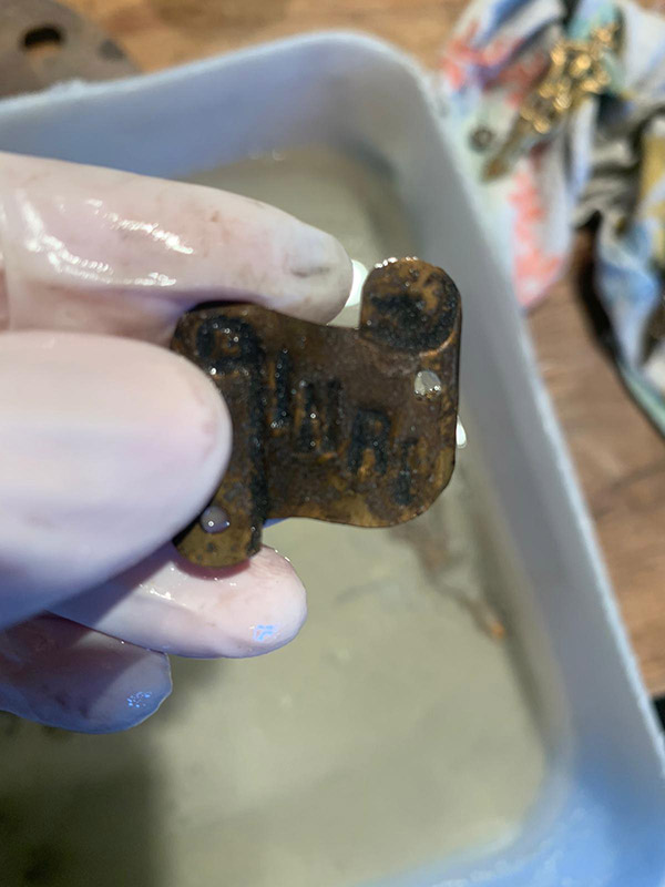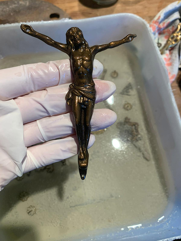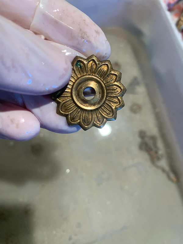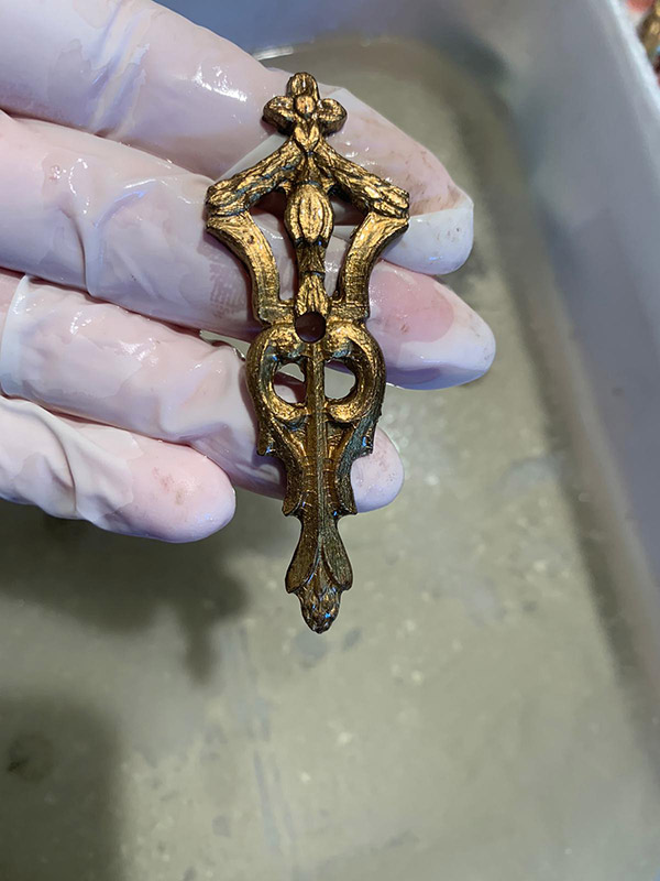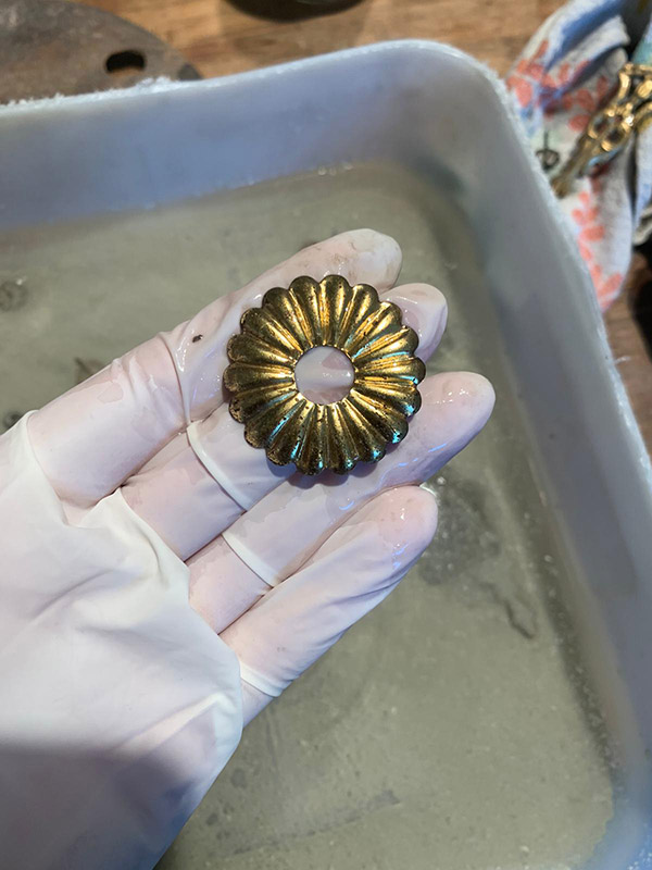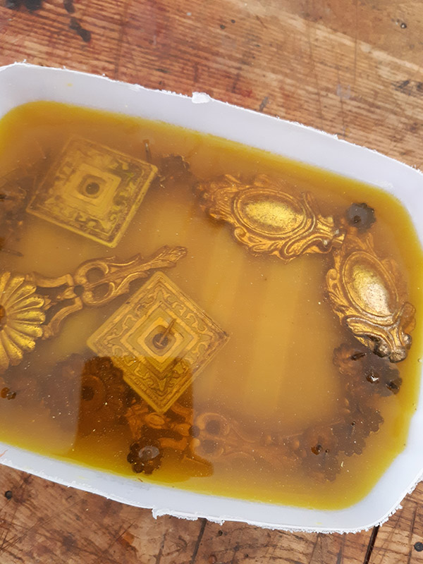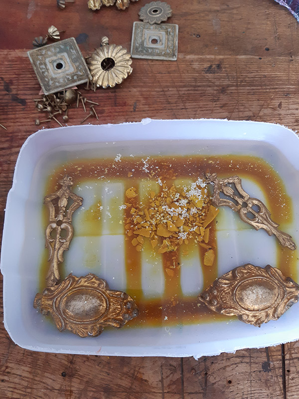 Il procedimento di antichizzazione degli elementi in bronzo e ottone con il fegato di zolfo (solfuro di potassio) è sicuramente il lavoro più intrigante.