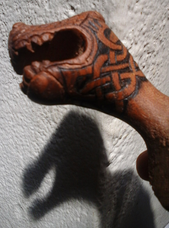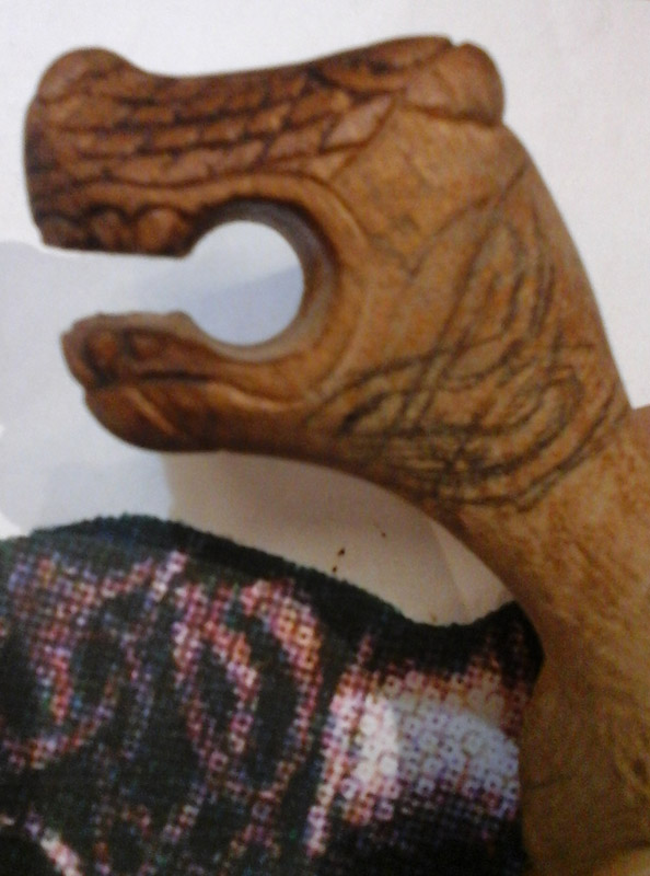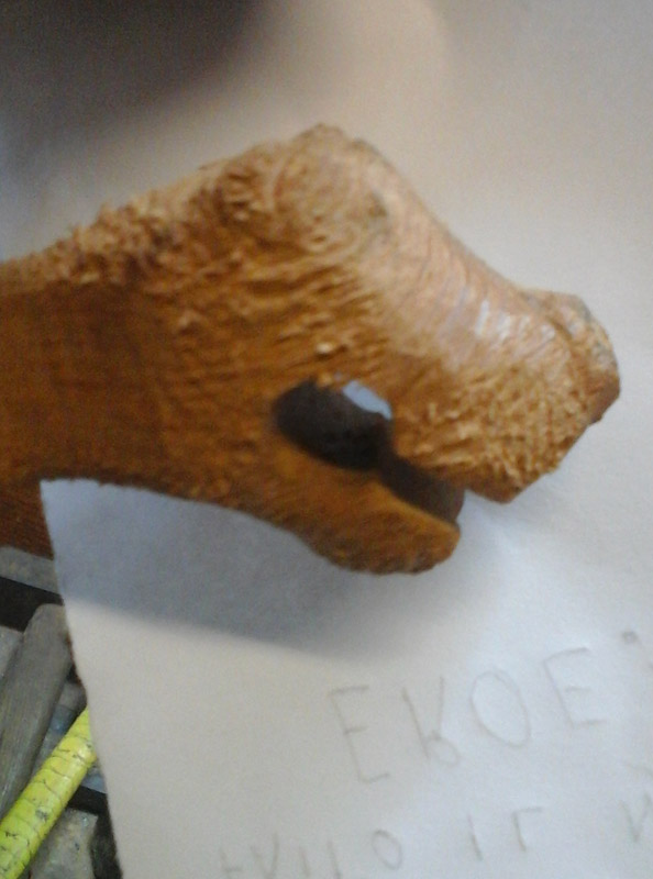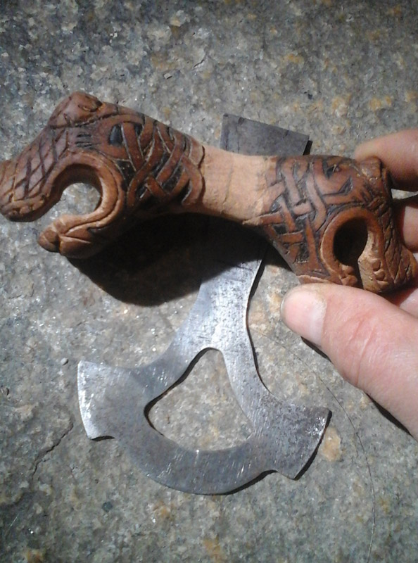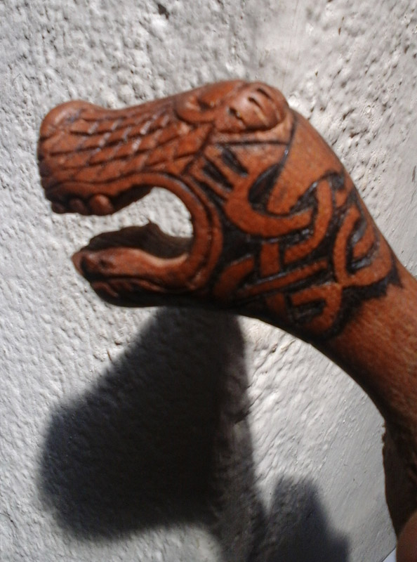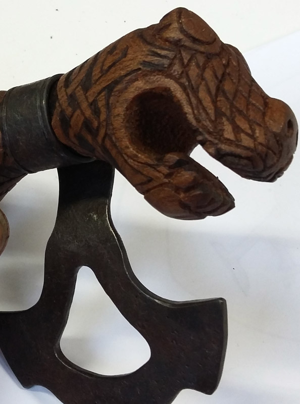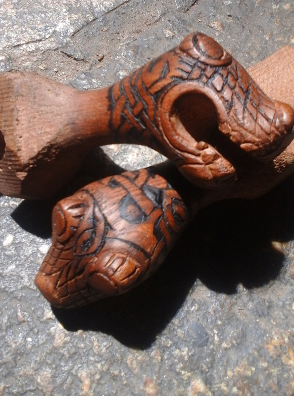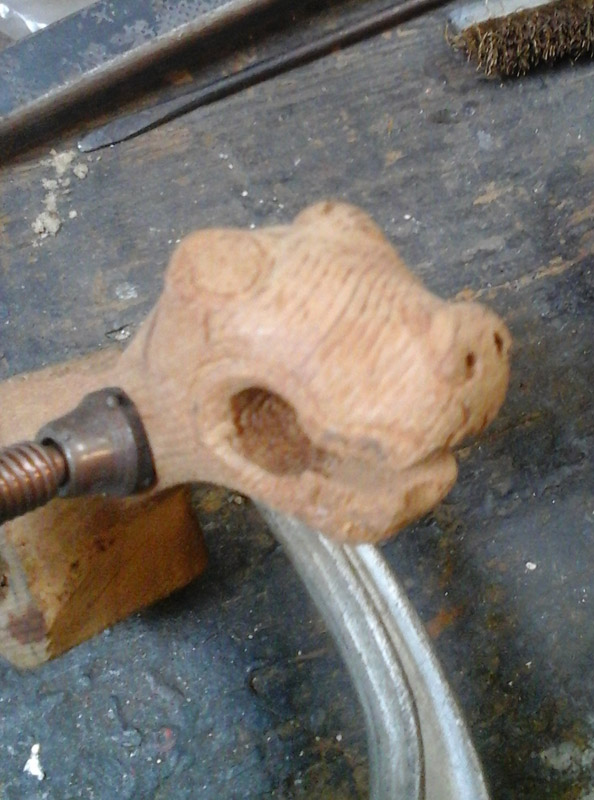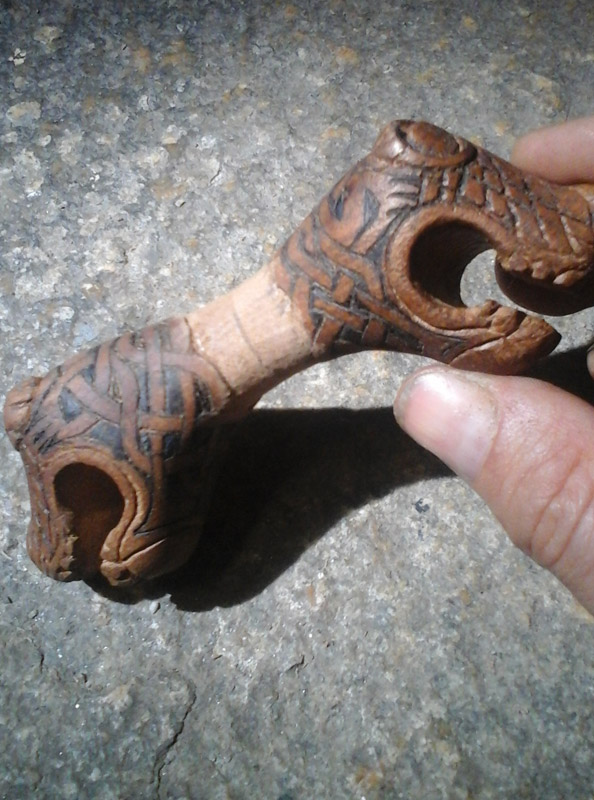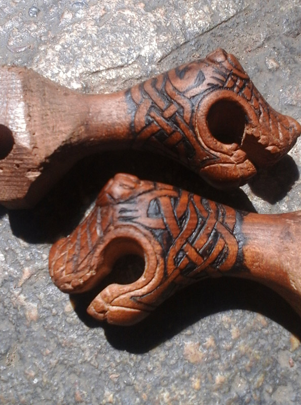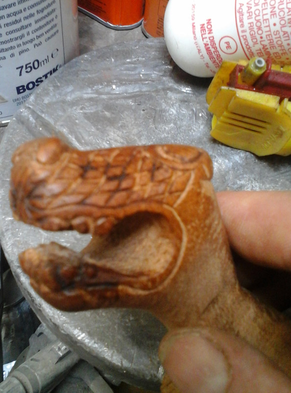 Intaglio a punta di coltello delle decorazioni ad intreccio vimini e colorazione delle teste.