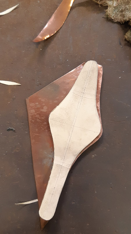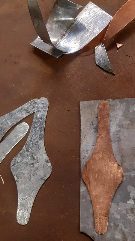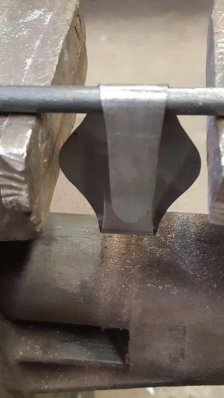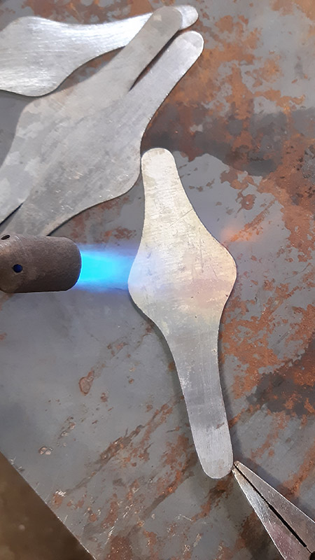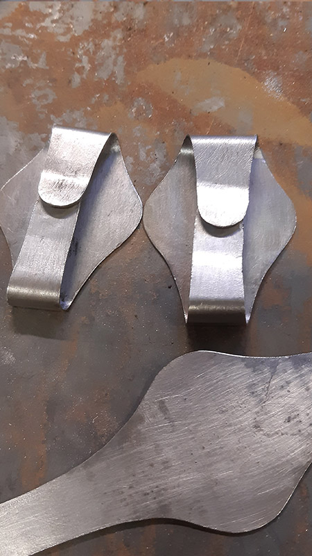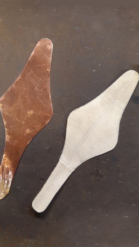 Basandomi su alcune fotografie ho ricostruito il gancio di sospensione simile agli autentici inizio ‘900. Realizzato un cartamodello e un prototipo in rame ho realizzato il gancio ferro. Temprato con la fiamma ossidrica per renderlo più armonico l’ho antichizzato con cere colorate.