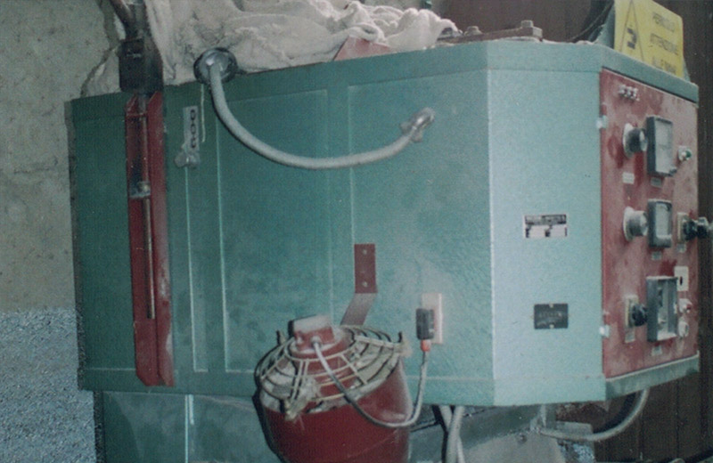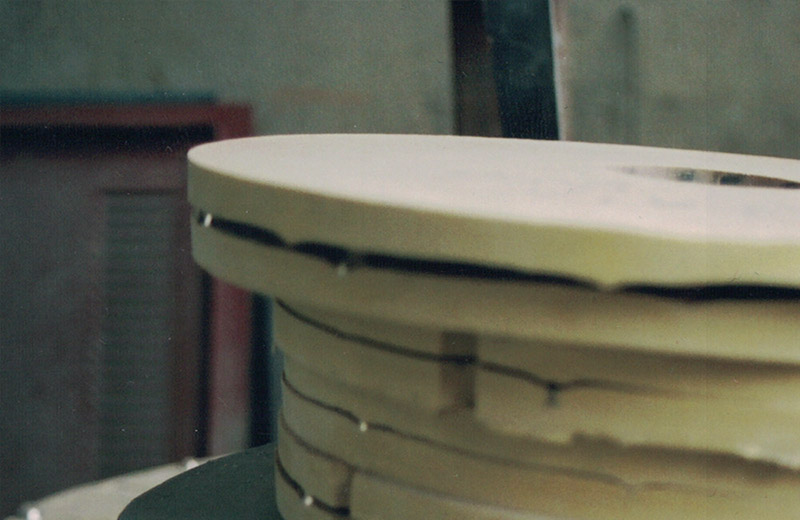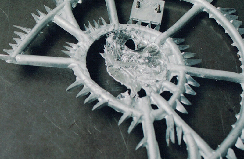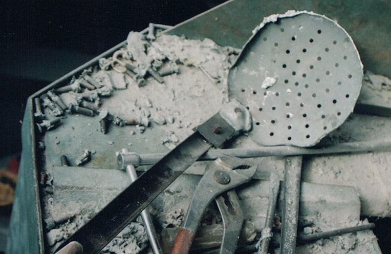 Inserita la gomma nella centrifuga del forno, si procede alla fusione dello zamac. Questa lega è composta da Zinco, Alluminio, Magnesio e Rame. I lingotti di metallo, piuttosto pesanti, vengono inseriti nel bocchettone del forno. Il metallo liquido scende velocemente all’interno della gomma a conchiglia che gira su di una centrifuga.