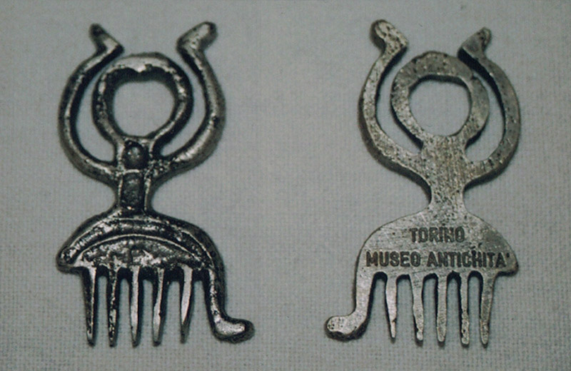 Il pettine, insieme a molti altri manufatti in bronzo (armi, utensili, ornamenti personali, ecc.), è stato trovato sul fondale del lago di Viverone, era uno dei oggetti usati dai nostri antenati che vivevano sulle palafitte. Questo oggetto del XV-XIII a.c. ha una particolare conformazione che suggerisce la forma umana.
