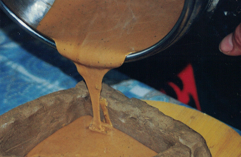 Terminato il lavaggio, si cola all’interno del negativo in gomma la resina bicomponente. Tale resina ha un’ottima resistenza al calore e alla pressione utili per ottenere il calco nella gomma da fonderia per lo zamac.