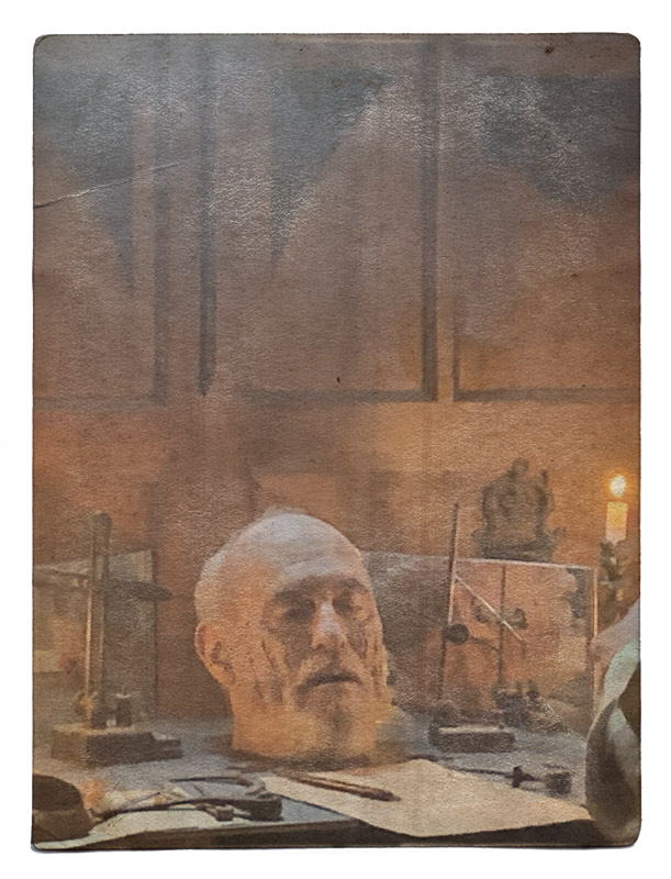 Creazione di un mobile stile 1850 capace di ospitare un attore lasciandone la testa a vista. Il piano di lavoro riproduce un fantasioso laboratorio di misurazioni encefaliche e studi frenologici.