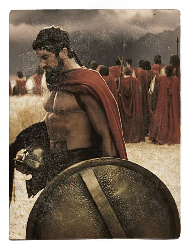 La replica dello scudo di Leonida è partita da un modello in ferro su cui ho lavorato con pigmenti e colori per imitare il più possibile i colpi inferti in battaglia.