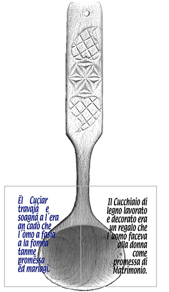 Il cucchiaio fatto a mano. quindi unico, viene decorato secondo la tradizione piemontese dell’intaglio a punta di coltello. Il cucchiaio di legno lavorato e decorato era un regalo che l’uomo faceva alla donna come promessa di matrimonio. Da non usare in cucina ma da appendere nella casa come porta fortuna per il futuro della coppia. Questa usanza si è mantenuta fino ai giorni d’oggi.