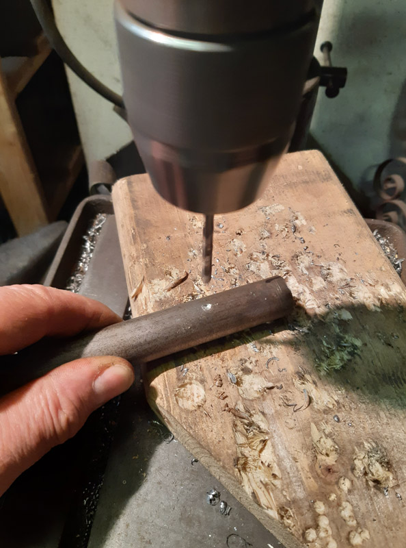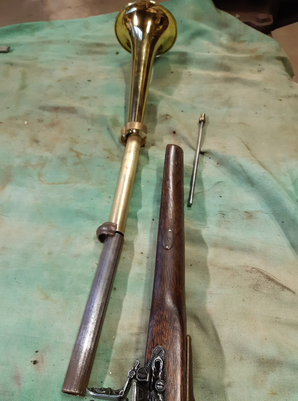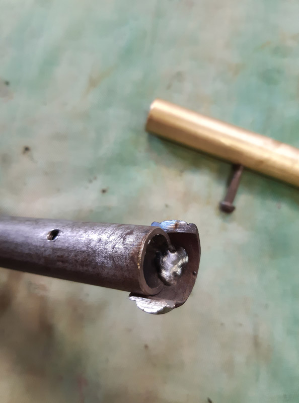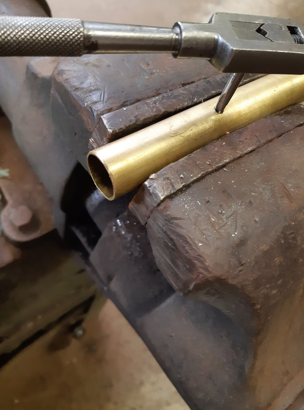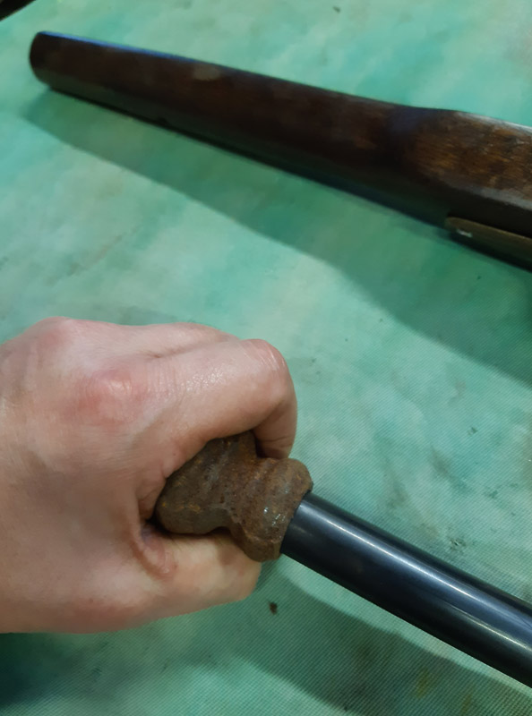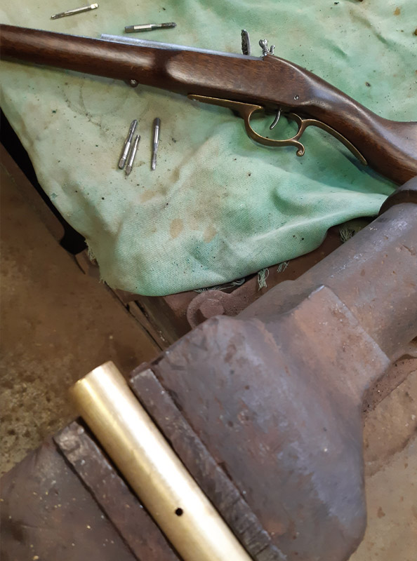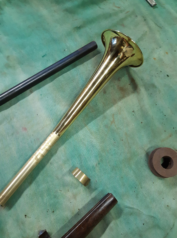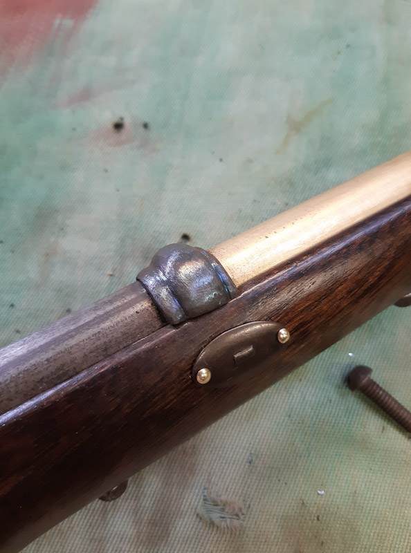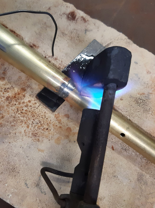 Saldatura del manicotto in ferro. Saldatura della canna in ottone con il trombone. Antichizzazione dell’ottone con il fegato di zolfo e colorazione della canna in ferro.