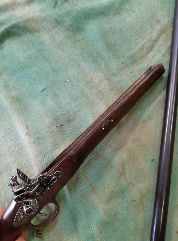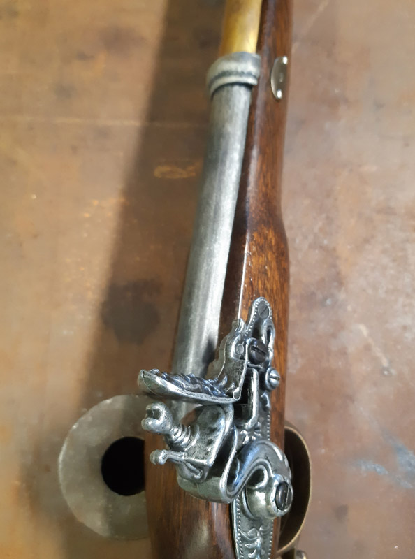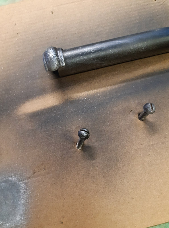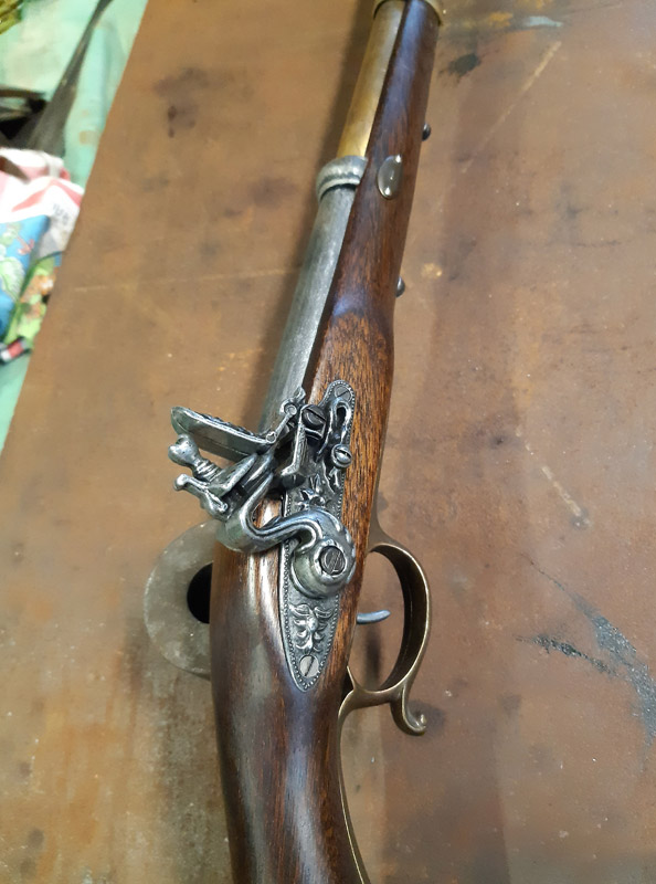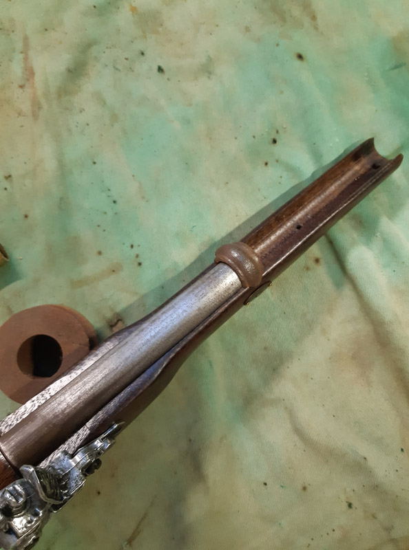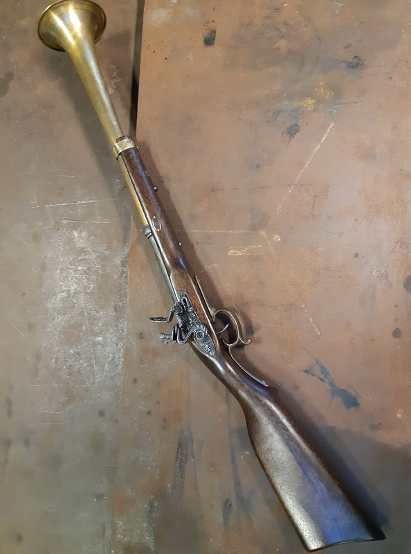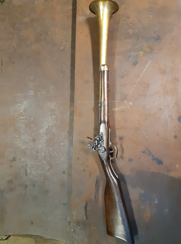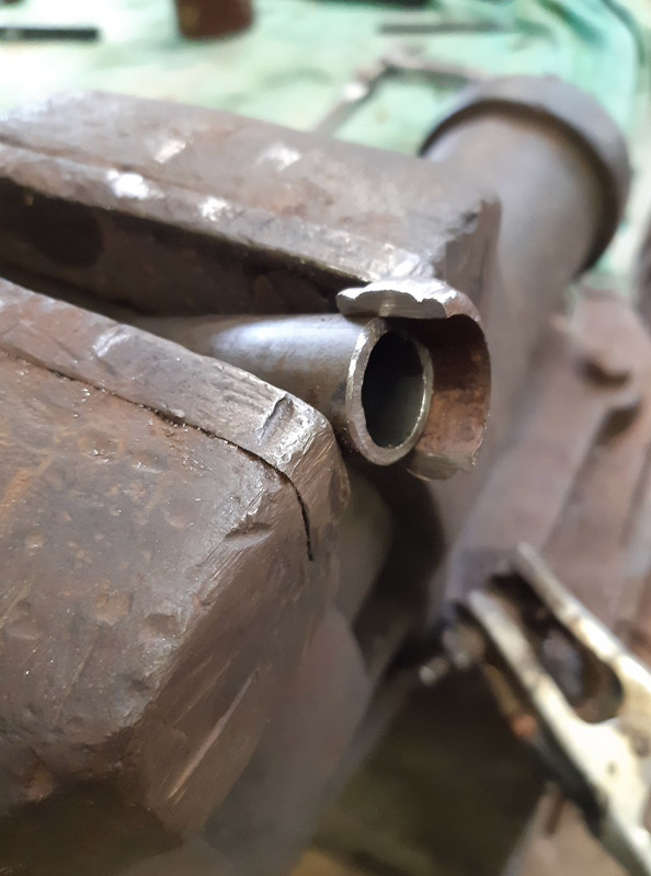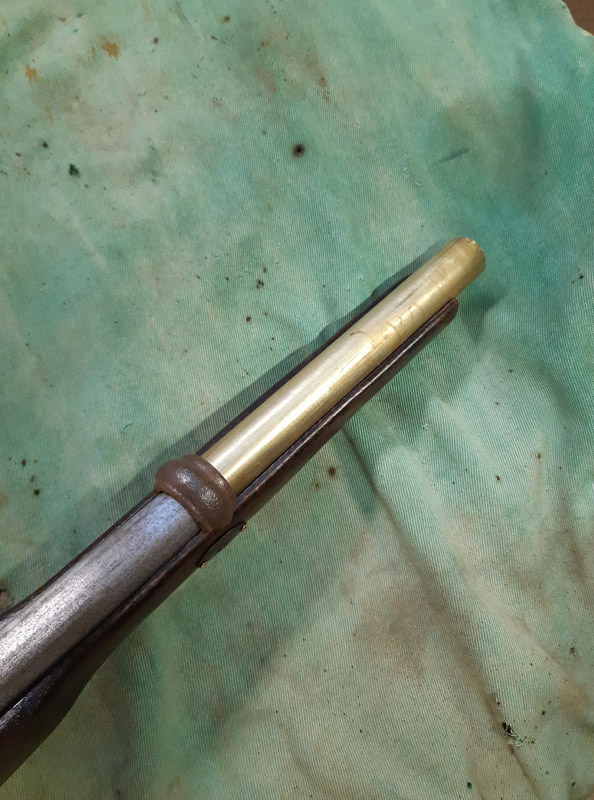 Saldatura del manicotto in ferro. Saldatura della canna in ottone con il trombone. Antichizzazione dell’ottone con il fegato di zolfo e colorazione della canna in ferro.